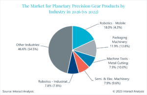 What factors are driving the growth of precision reducer products? The market for precision reducers and geared motors has experienced significant growth over the past few years. According to Interact Analysis, global reducer sales are expected to grow by 17% in 2022. By 2027, the market size is expected to exceed $5 billion, albeit at a slightly slower pace than in previous boom years. As a key component in motion control systems, the growth of the precision reducer market is primarily driven by increasing automation in manufacturing and the growth of the robotics market. However, it is also driven by excessive advance ordering and price increases. Recognizing the need for automation amidst labor shortages and fearing future price increases or supply chain issues that could impact delivery times, customers are placing orders in advance, leading to a significant backlog of orders for reducer manufacturers. Types of Precision Reducers Precision reducers can be primarily divided into three types: Planetary Reducers Harmonic Reducers Cycloid Reducers Over the past year, the market for harmonic and cycloid RV reducers has grown faster than the planetary reducer market, primarily driven by demand for robots. Harmonic and RV reducers are primarily used in multi-jointed robots and collaborative robots. Compared to the lowest-backlash, most “precise” harmonic and cycloid reducers typically used in industrial robots, precision planetary reducers have a broader application market, including the rapidly growing mobile robotics market. The precision reducer market continues to be dominated by planetary reducers. According to our research, less than 50% of all precision reducers sold globally in 2022 will be planetary reducers. Packaging machinery is the primary application area for planetary reducers, accounting for 14% of global sales. Metal cutting machine tools, semiconductor and electronic machinery, material handling, and industrial robots (primarily delta robots) follow closely behind in terms of sales share, demonstrating the breadth and diversity of the downstream market for planetary precision reducers. We forecast significant changes in the downstream market for planetary precision reducers between 2022 and 2026: The mobile robotics sector will see a significant increase in sales, becoming the largest downstream market by 2026, accounting for 18% of sales, significantly higher than the 4.3% in 2022. The figure below shows our forecasted sales share of the downstream market for planetary precision reducers in 2026. The figures in parentheses represent the market situation in 2022. It can be seen that packaging machinery is currently the largest application market for planetary reducers, but mobile robots have the fastest growth rate and will jump to first place in 2026.
